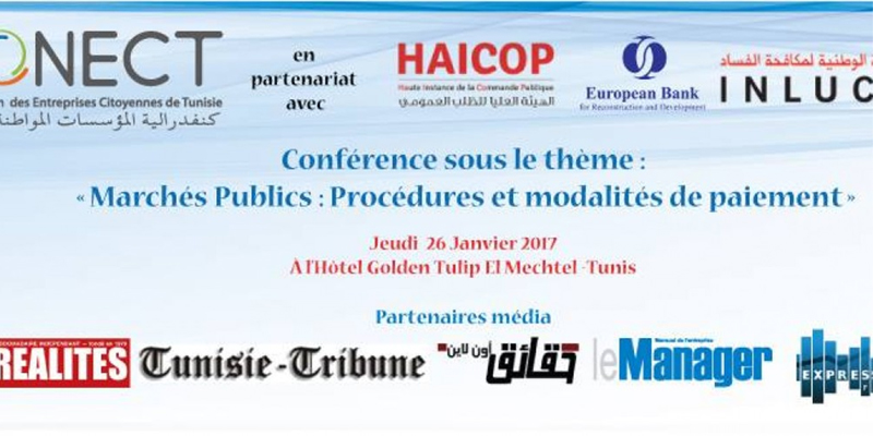 Participation de l’Agence nationale de certification électronique (TUNTRUST) à une conférence sous le thème :« Marchés Publics: Procédures et les Modalités de paiement » organisée par La CONECT en partenariat avec la Haute Instance de la Commande Publique "HAICOP", l'Instance de Lutte Contre la Corruption "INLUCC" et la Banque européenne pour la reconstruction et le développement "BERD" , le 26 Janvier 2017 à l’hôtel Golden Tulip El Mechtel - Tunis.