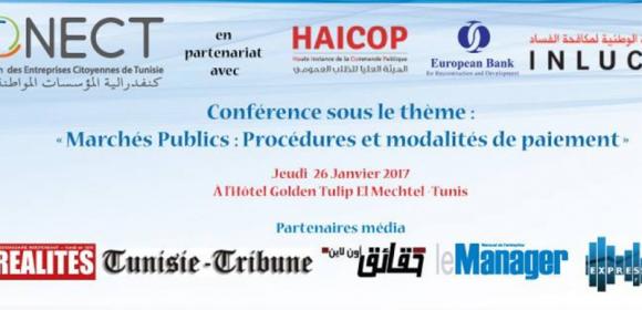 Participation de l’Agence nationale de certification électronique (TUNTRUST) à une conférence sous le thème :« Marchés Publics: Procédures et les Modalités de paiement » organisée par La CONECT en partenariat avec la Haute Instance de la Commande Publique "HAICOP", l'Instance de Lutte Contre la Corruption "INLUCC" et la Banque européenne pour la reconstruction et le développement "BERD" , le 26 Janvier 2017 à l’hôtel Golden Tulip El Mechtel - Tunis.
